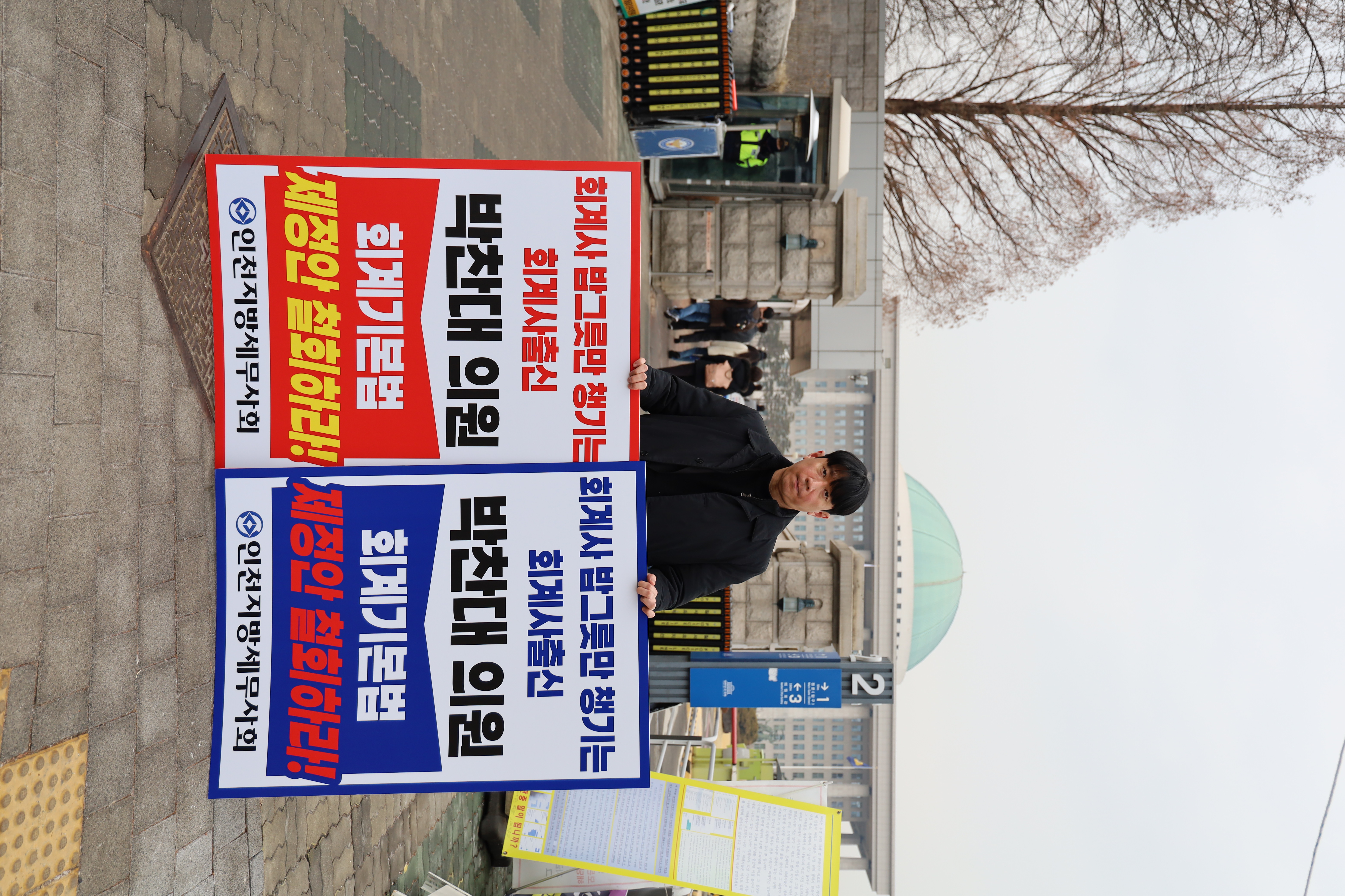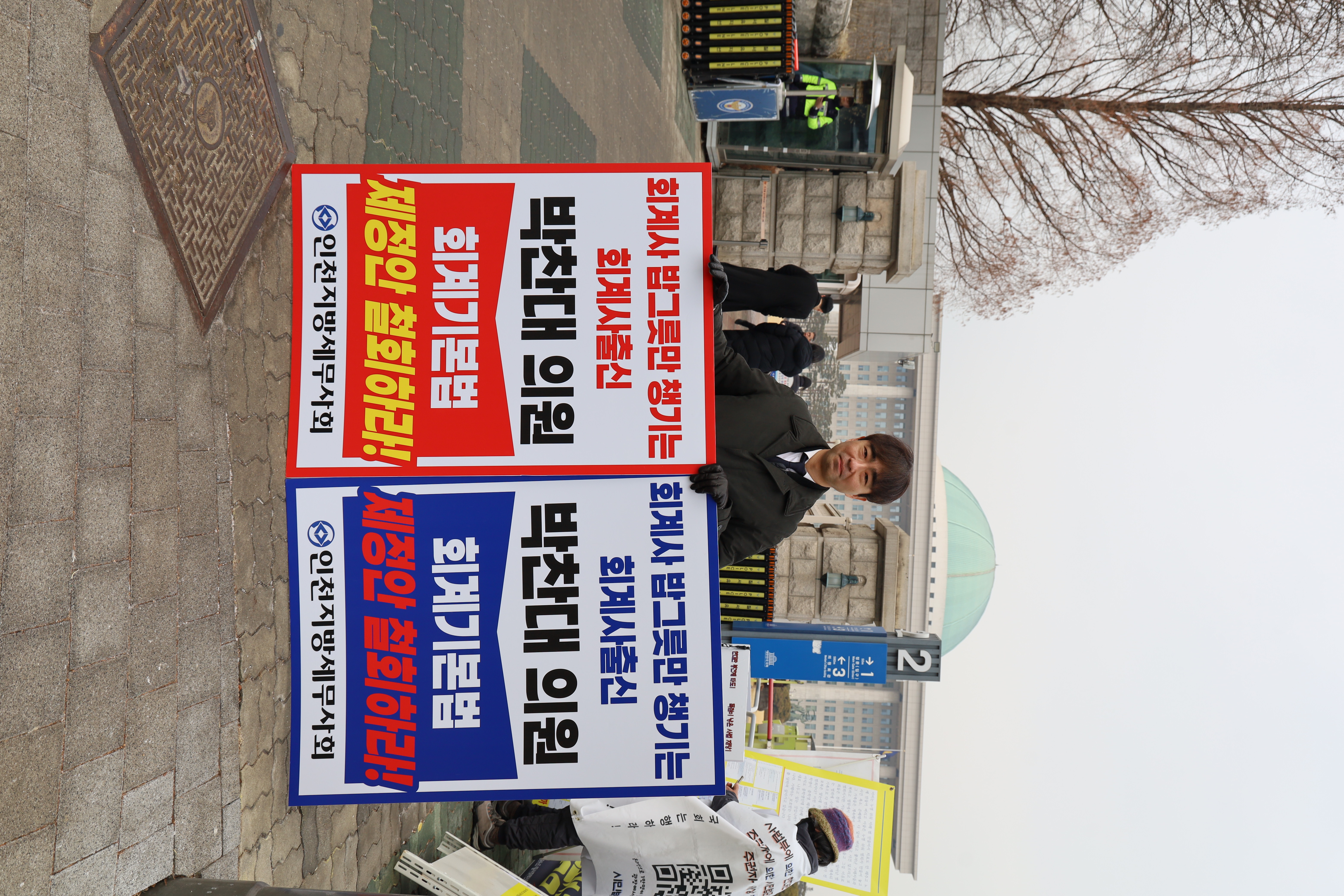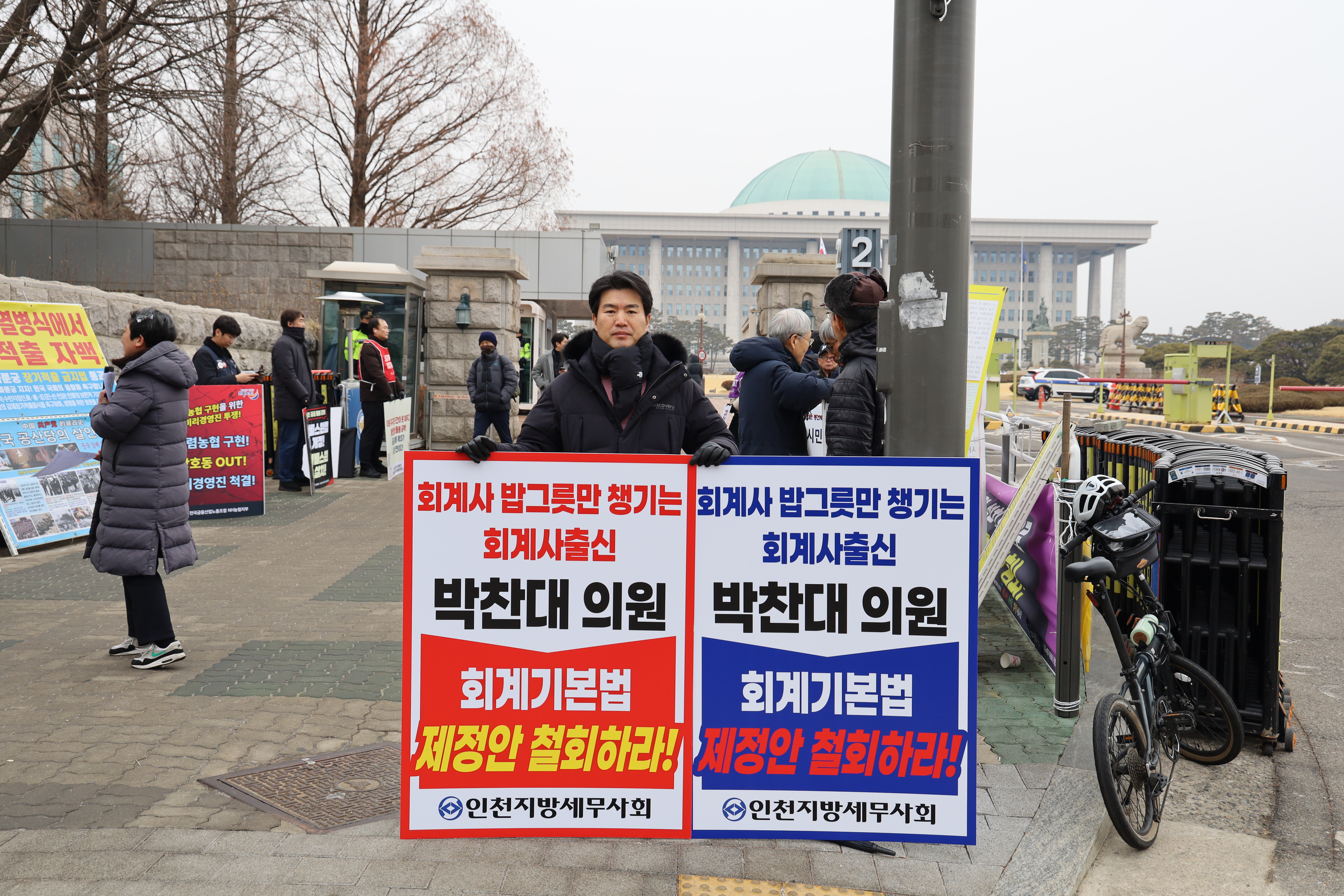 2026년 2월 10일, 인천지방세무사회 소속 세무사들이 국회 정문 앞에서 박찬대 의원(더불어민주당, 인천 연수구갑)이 발의한 ‘회계기본법’ 제정안의 즉각 철회를 요구하는 1인 시위를 전개했다.