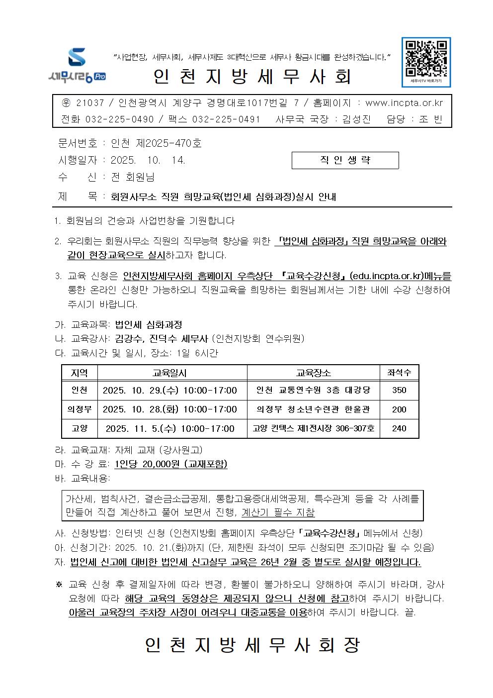 회원사무소 직원 희망교육(법인세 심화과정) 실시 안내