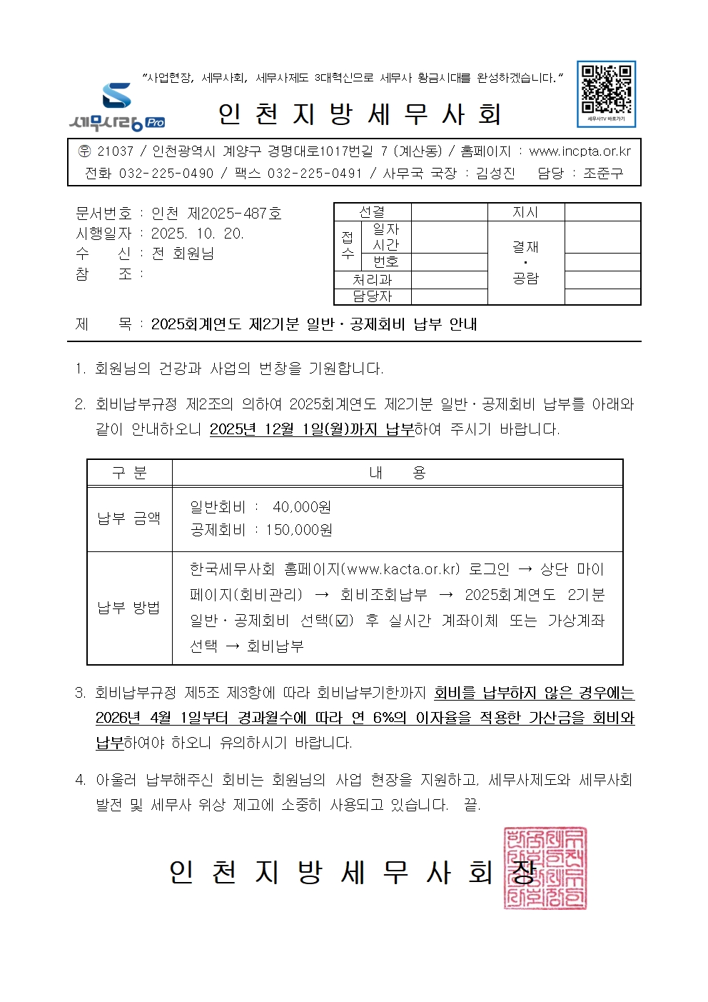 2025회계연도 제2기분 일반 공제회비 납부 안내