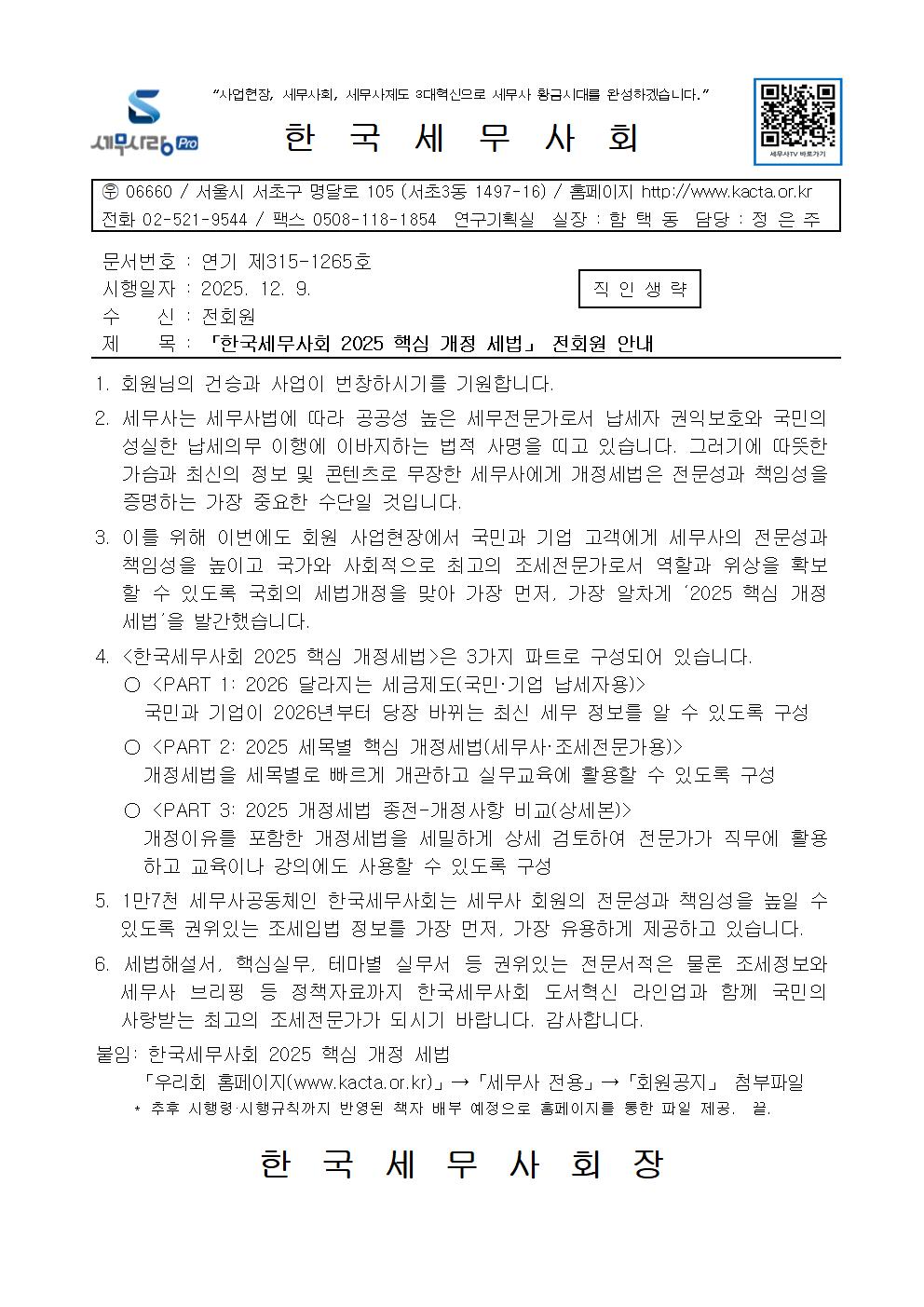 ¡¸Çѱ¹¼¼¹«»çȸ 2025 ÇÙ½É °³Á¤ ¼¼¹ý¡¹ Àüȸ¿ø ¾È³»