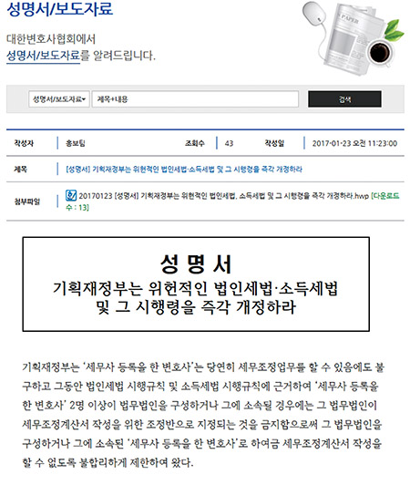 Çѱ¹¼¼¹«»çȸ´Â ¶Ç ¡°º¯ÇùÀº ±âȹÀçÁ¤ºÎ°¡ ´ë¹ý¿ø ÆÇ°á(2015. 8. 20.) 8Àϸ¸¿¡ ¹ýÀμ¼¹ý¡¤¼Òµæ¼¼¹ý °³Á¤¾ÈÀ» ÀÔ¹ý¿¹°í(2015. 8. 28.¡9. 1.)ÇÑ °ÍÀÌ ¼¼¹«»çÀÇ ÀÌÀ͸¸À» °í¼öÇÏ´Â ÇàŶó°í ÁÖÀåÇϰí ÀÖÀ¸³ª ÀÌ´Â ¡°±âȹÀçÁ¤ºÎ°¡ ¡®³³¼¼ÀÚ ±ÇÀÍ Ä§ÇØ¡¯¿Í ¡®¼¼Á¤ È¥¶õ¡¯À» ¹Ì¿¬¿¡ ¹æÁöÇϱâ À§ÇØ ´ë¹ý¿ø ÆÇ°á ÃëÁö¿¡ µû¶ó ½Å¼ÓÇÏ°Ô ¿ÜºÎ¼¼¹«Á¶Á¤Á¦µµÀÇ ÀÔ¹ý ü°è»óÀÇ °áÇÔÀ» ¹Ù·Î Àâ¾Æ ¿ÜºÎ¼¼¹«Á¶Á¤Á¦µµ ¹× Á¶Á¤¹ÝÁ¦µµ µî¿¡ ´ëÇÑ À§ÀӱٰŸ¦ ¹ý·ü¿¡ Á÷Á¢ ±ÔÁ¤Çϱâ À§ÇÔ¡±À̶ó°í ÁöÀûÇß´Ù.
