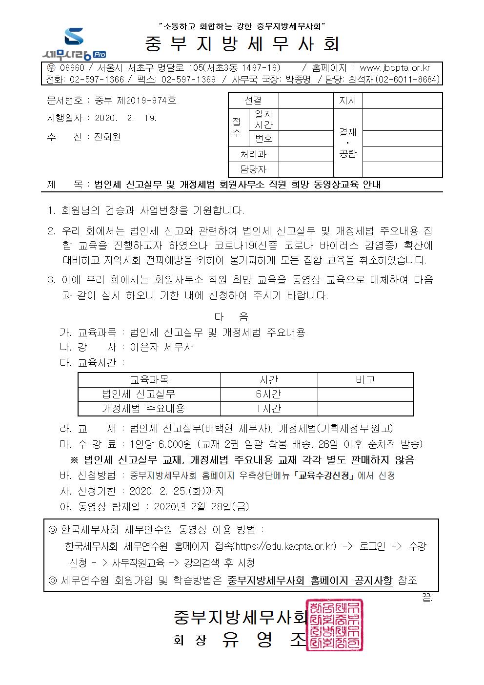 | 법인세 신고실무 및 개정세법 회원사무소 직원 희망 동영상교육 안내 |