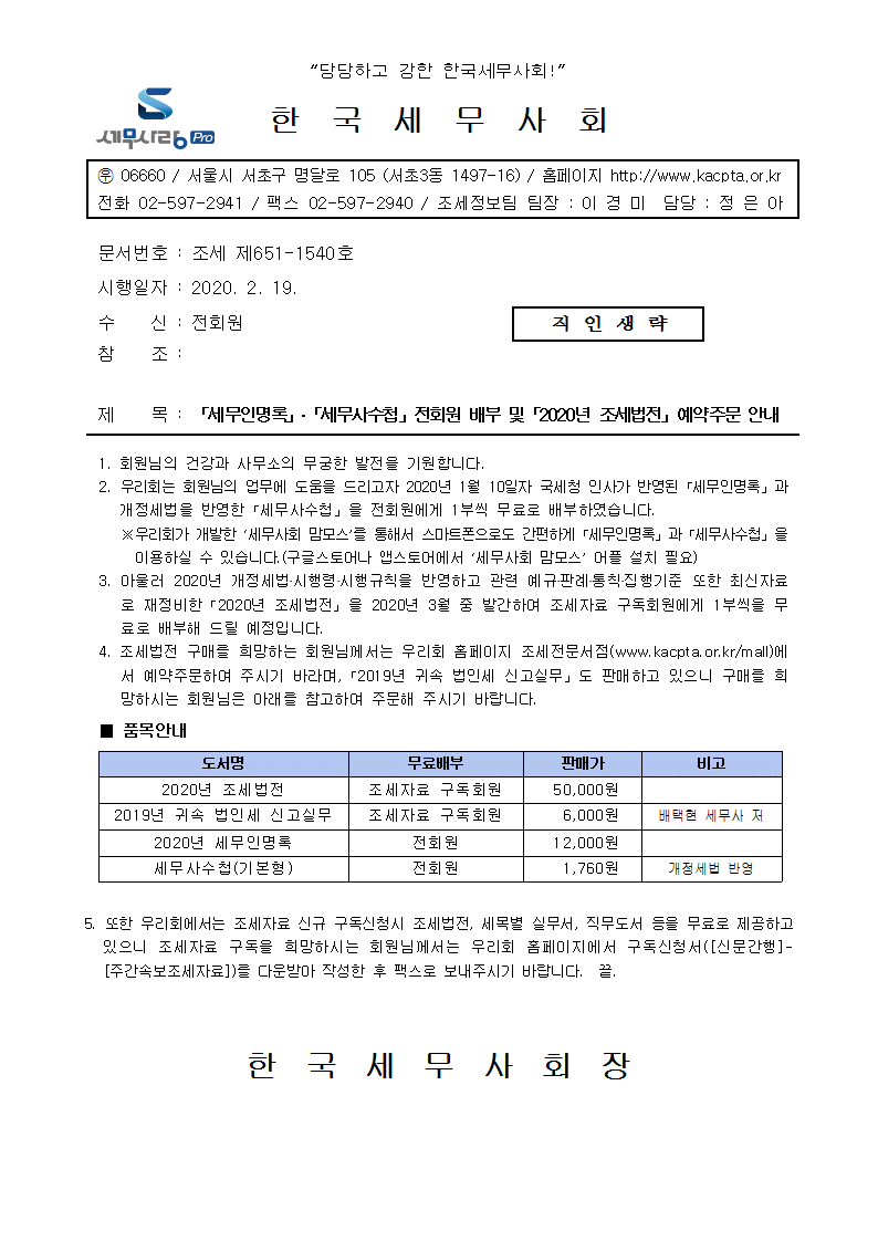 | 「세무인명록」ㆍ「세무사수첩」전회원 배부 및「2020년 조세법전」예약주문 안내 |