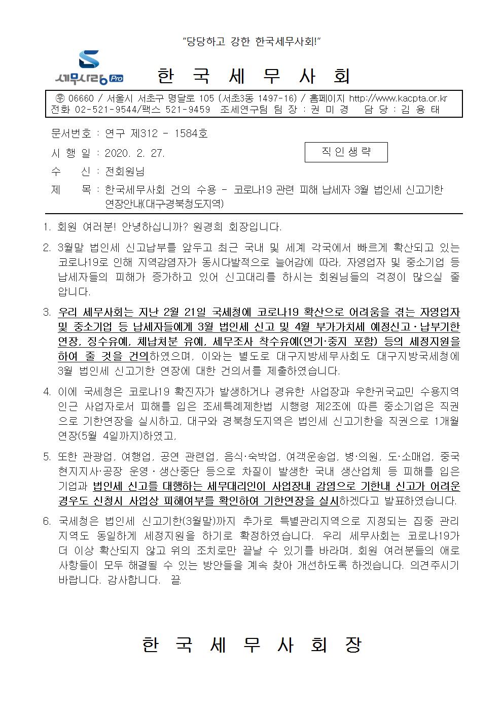 | 2020_1.02.27_(전회원시행문)_한국세무사회 건의수용_코로나19 피해 납세자 법인세신고기한 연장.pdf | 54.73kb | 177 |