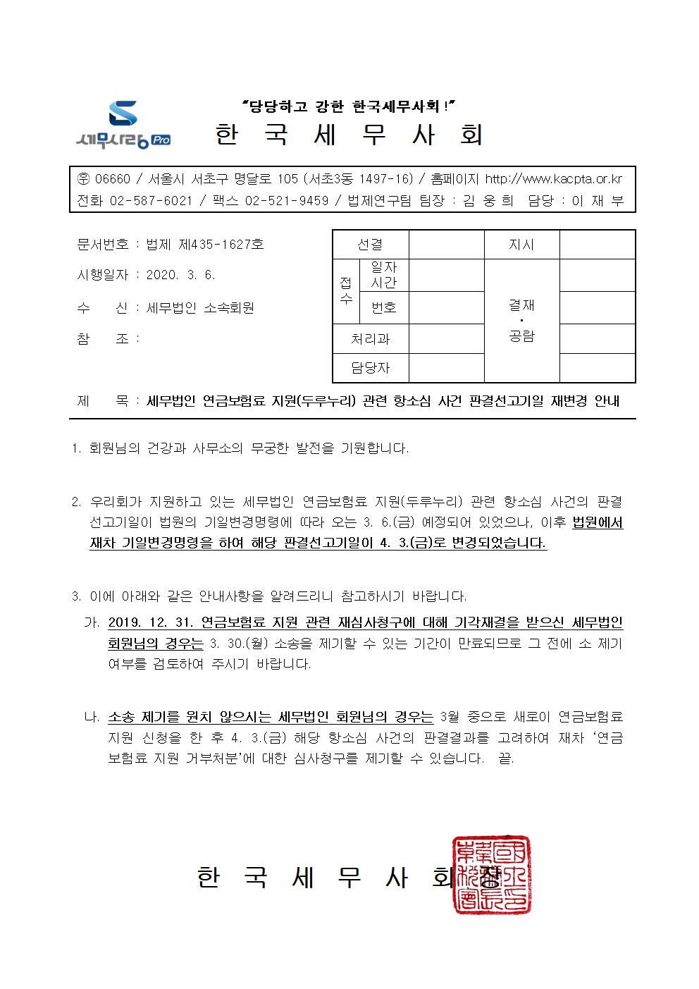 | 세무법인 연금보험료 지원(두루누리) 관련 항소심 사건 판결선고기일 재변경 안내 |