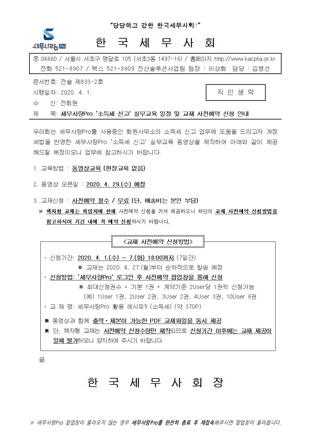 | 세무사랑Pro '소득세 신고' 실무교육 일정 및 교재 사전예약 신청 안내 |