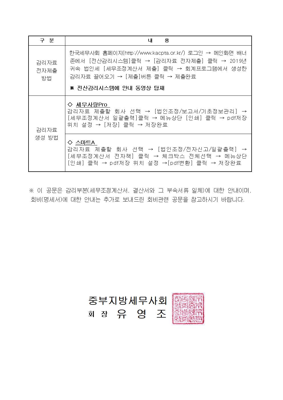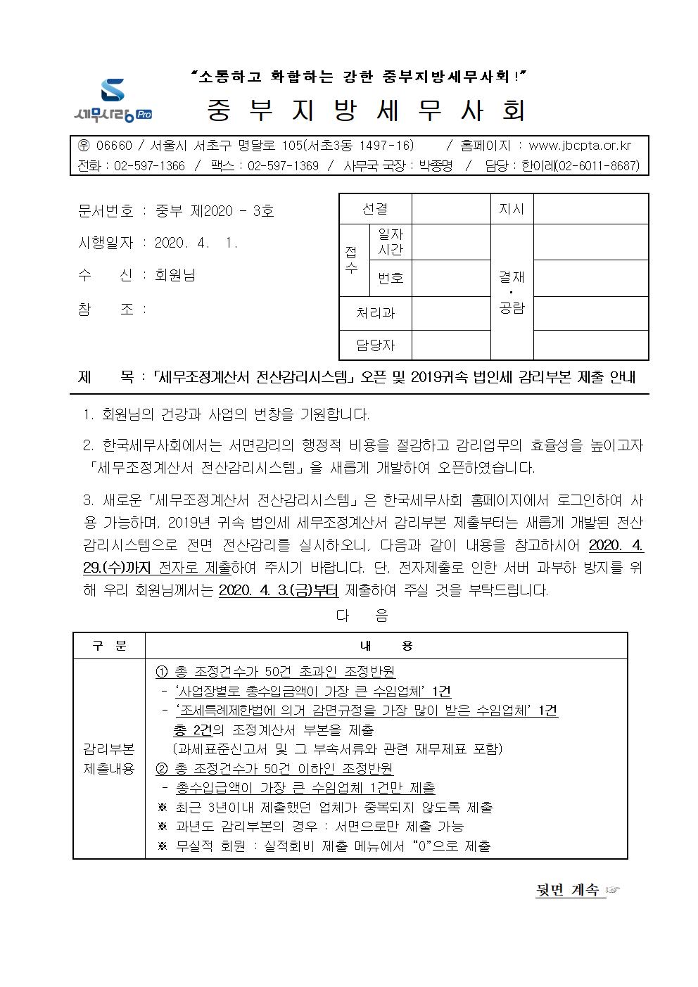 | 세무조정계산서 전산감리시스템 오픈 및 2019귀속 법인세 감리부본 제출 안내 |