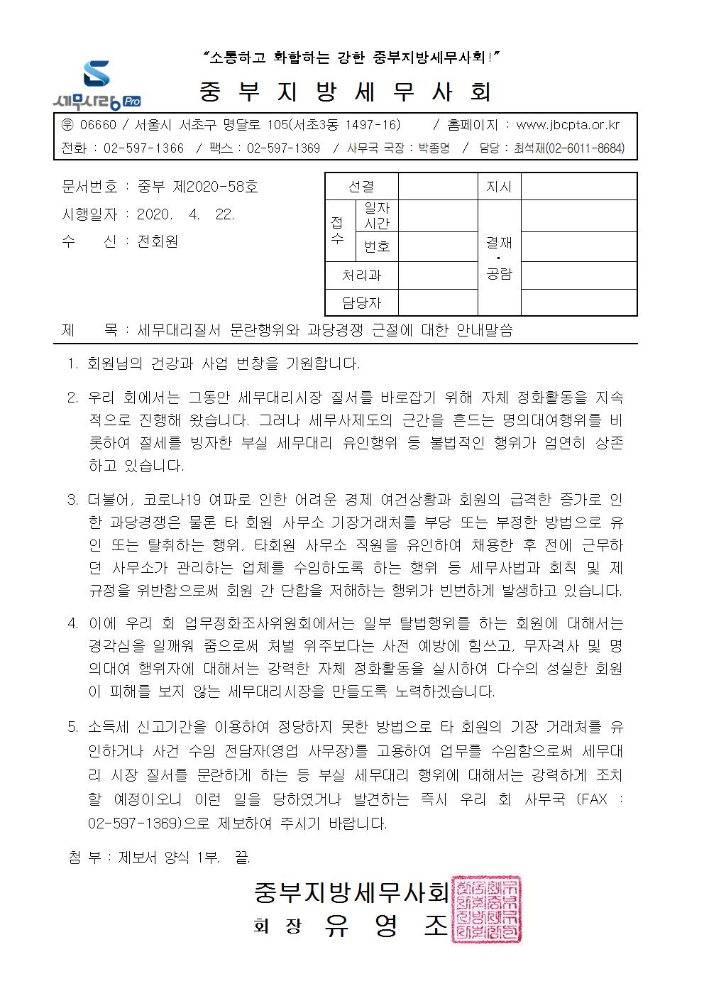 | 세무대리질서 문란행위와 과당경쟁 근절에 대한 안내 말씀 |