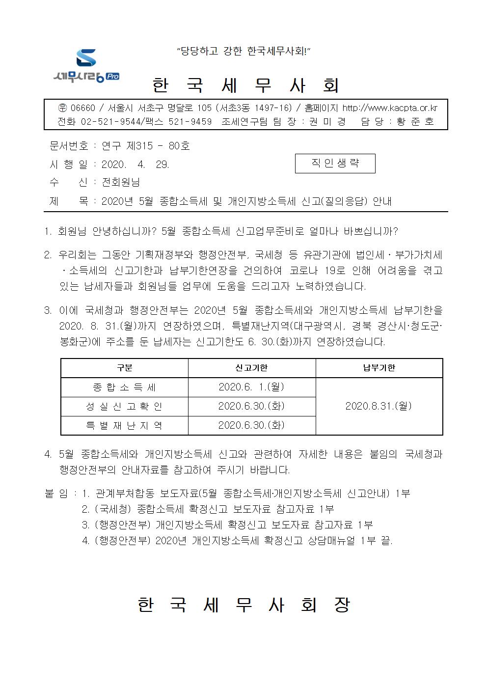 | 2020년 5월 종합소득세 및 개인지방소득세 신고(질의응답) 안내 |