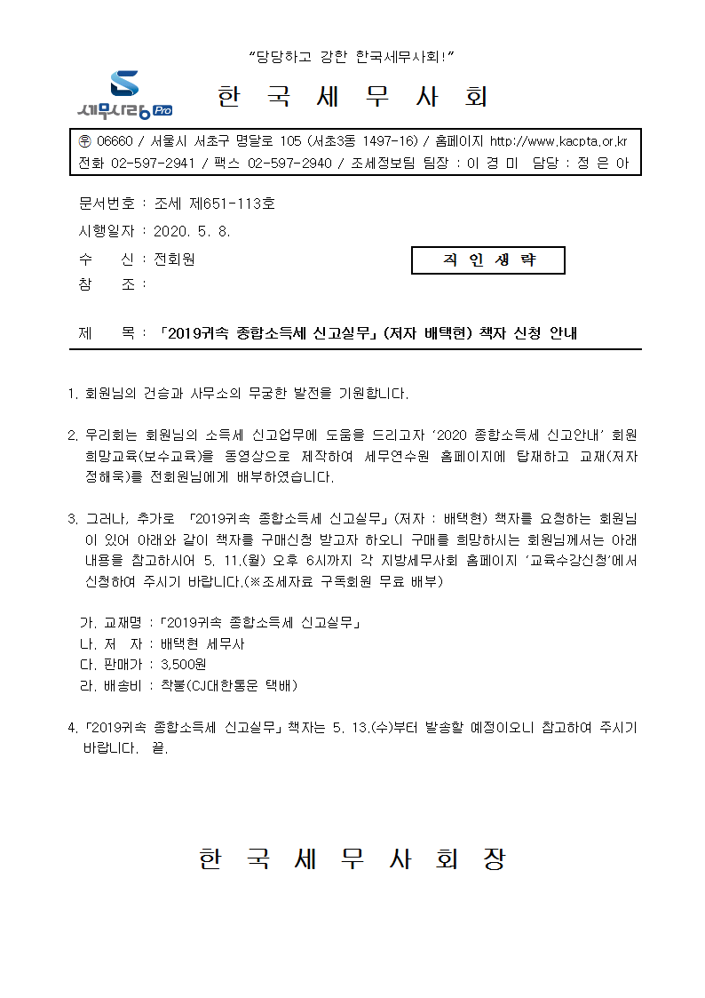 종합소득세 신고 실무(저자 배택현) 교재 신청 안내 |