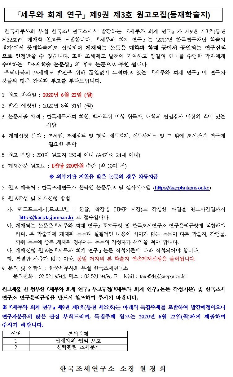 | 『세무와 회계 연구』 제9권 제3호 원고모집(등재학술지) |
