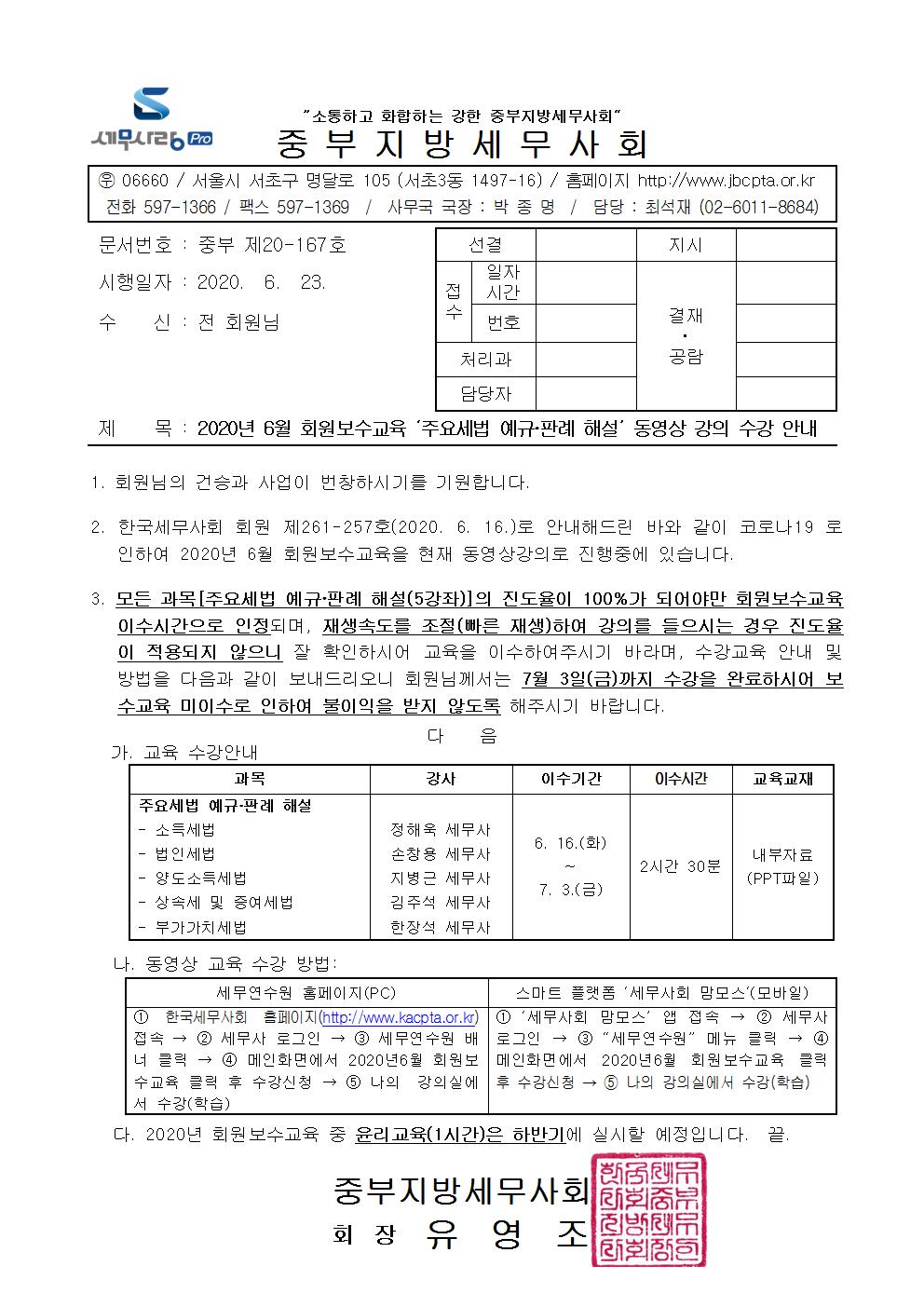 | 2020년 6월 회원보수교육 '주요세법 예규 판례 해설' 동영상 강의 수강 안내 |