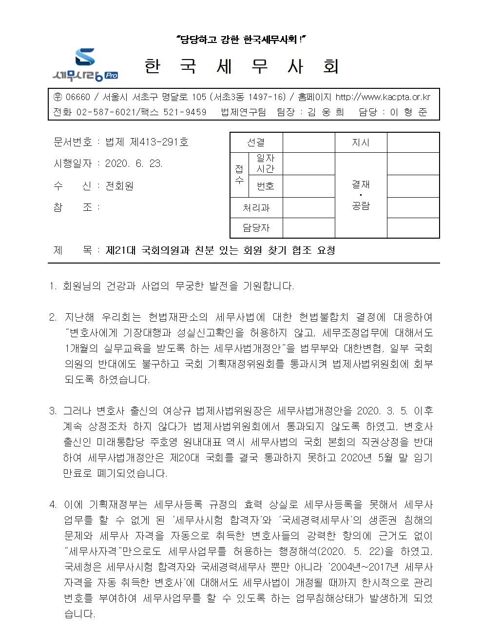 | 법제 제413-291호, 2020.06.23(제21대 국회의원과 친분 있는 회원 찾기 협조 요청).pdf | 173.99kb | 64 |