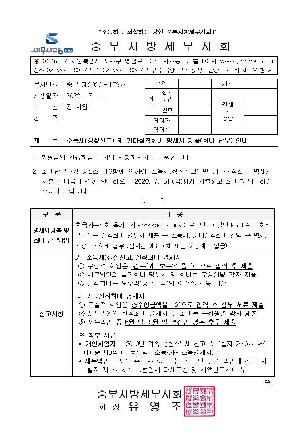 | 소득세(성실신고) 및 기타실적회비 명세서 제출(회비 납부) 안내 |