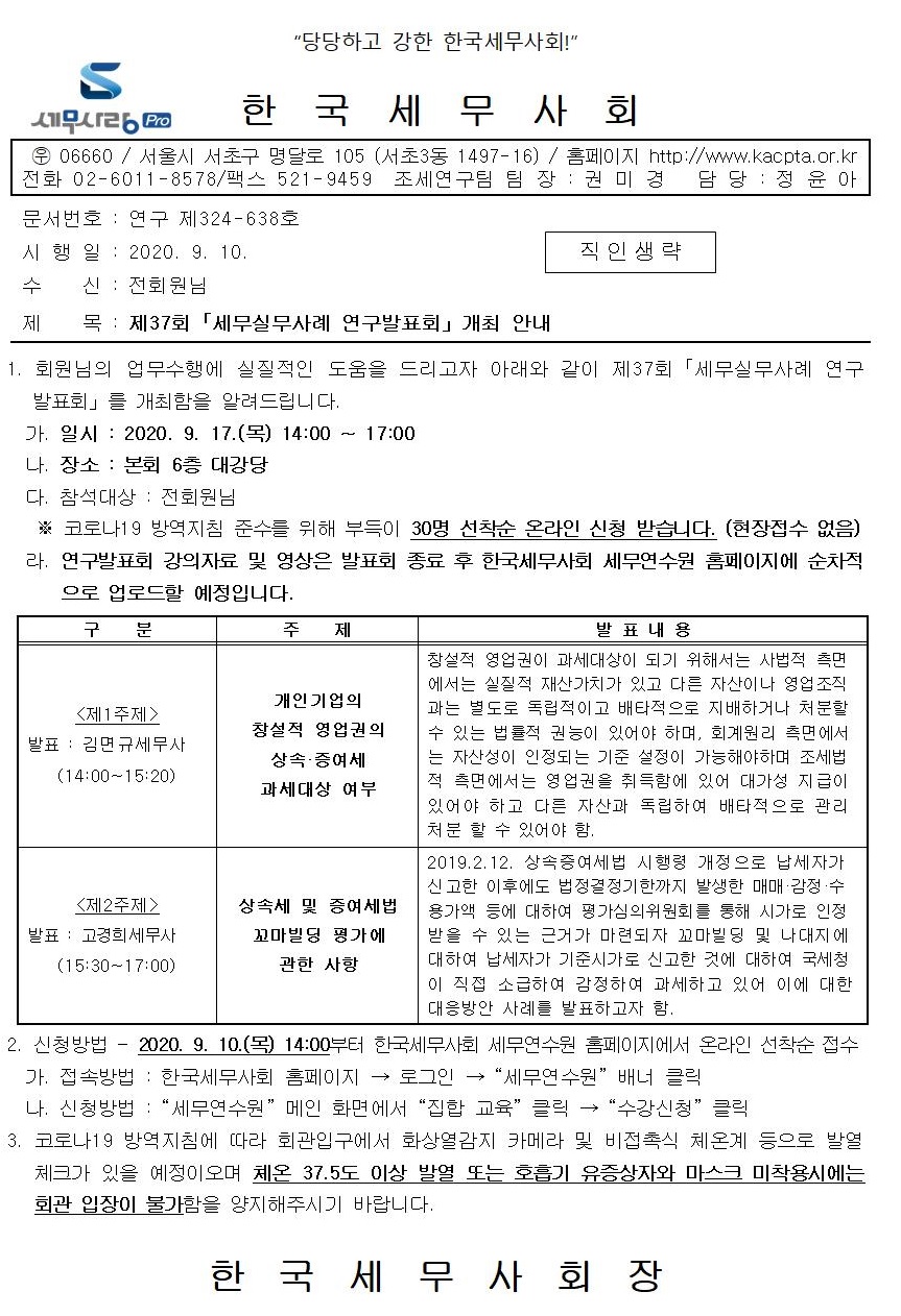 | 제37회「세무실무사례 연구발표회」개최 안내 |
