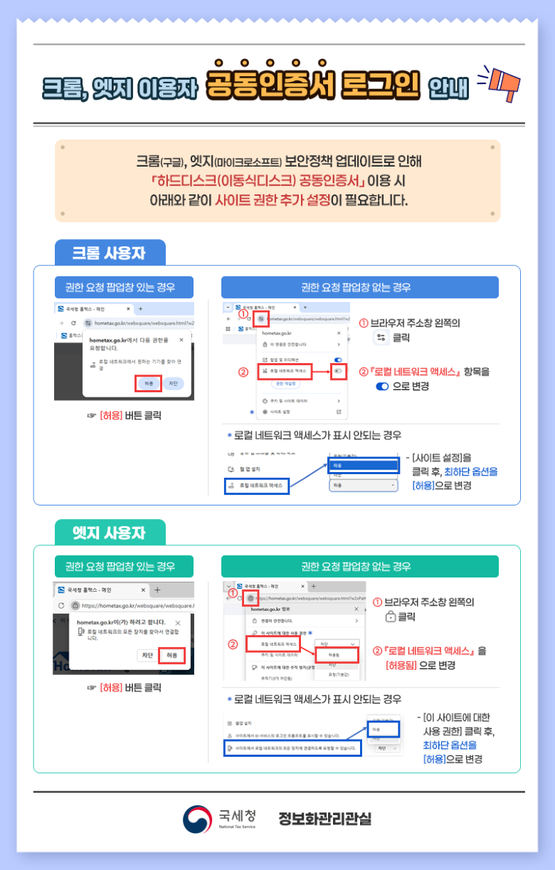 1. ȸ¿ø´ÔÀÇ °Ç°°ú »ç¾÷ÀÇ ¹øÃ¢À» ±â¿øµå¸³´Ï´Ù. 2. ±¹¼¼Ã»¿¡¼´Â ¿ì¸®È¸¿¡ ¡°Å©·Ò¡¤¿§Áö ºê¶ó¿ìÀúÀÇ º¸¾ÈÁ¤Ã¥ ¾÷µ¥ÀÌÆ®·Î ÀÎÇØ¡¸Çϵåµð½ºÅ©(À̵¿½Äµð½ºÅ©) °øµ¿ÀÎÁõ¼¡¹¸¦ ÀÌ¿ëÇÏ´Â °æ¿ì »çÀÌÆ® ±ÇÇÑ Ãß°¡ ¼³Á¤ Çʿ䡱¿¡ ´ëÇØ ¡®¡¸Å©·Ò, ¿§Áö ÀÌ¿ëÀÚ È¨Åýº °øµ¿ÀÎÁõ¼ ·Î±×ÀÎ ¾È³»¡¹¡¯ È«º¸ ÇùÁ¶¸¦ ÇÏ¿´½À´Ï´Ù. 3. 1¿ù ȨÅýº ÀÌ¿ë ÁýÁ߱Ⱓ Áß ºÒÆí»çÇ×À» »çÀü¿¡ ¹æÁöÇϱâ À§ÇØ ºÙÀÓÀÇ¡¸Å©·Ò, ¿§Áö ÀÌ¿ëÀÚ È¨Åýº °øµ¿ÀÎÁõ¼ ·Î±×ÀÎ ¾È³»¡¹¸¦ Âü°íÇÏ½Ã¾î »çÀÌÆ® ±ÇÇÑ Ãß°¡ ¼³Á¤À» ÇϽñ⠹ٶø´Ï´Ù. ºÙÀÓ : Å©·Ò, ¿§Áö ÀÌ¿ëÀÚ °øµ¿ÀÎÁõ¼ ·Î±×ÀÎ ¾È³»