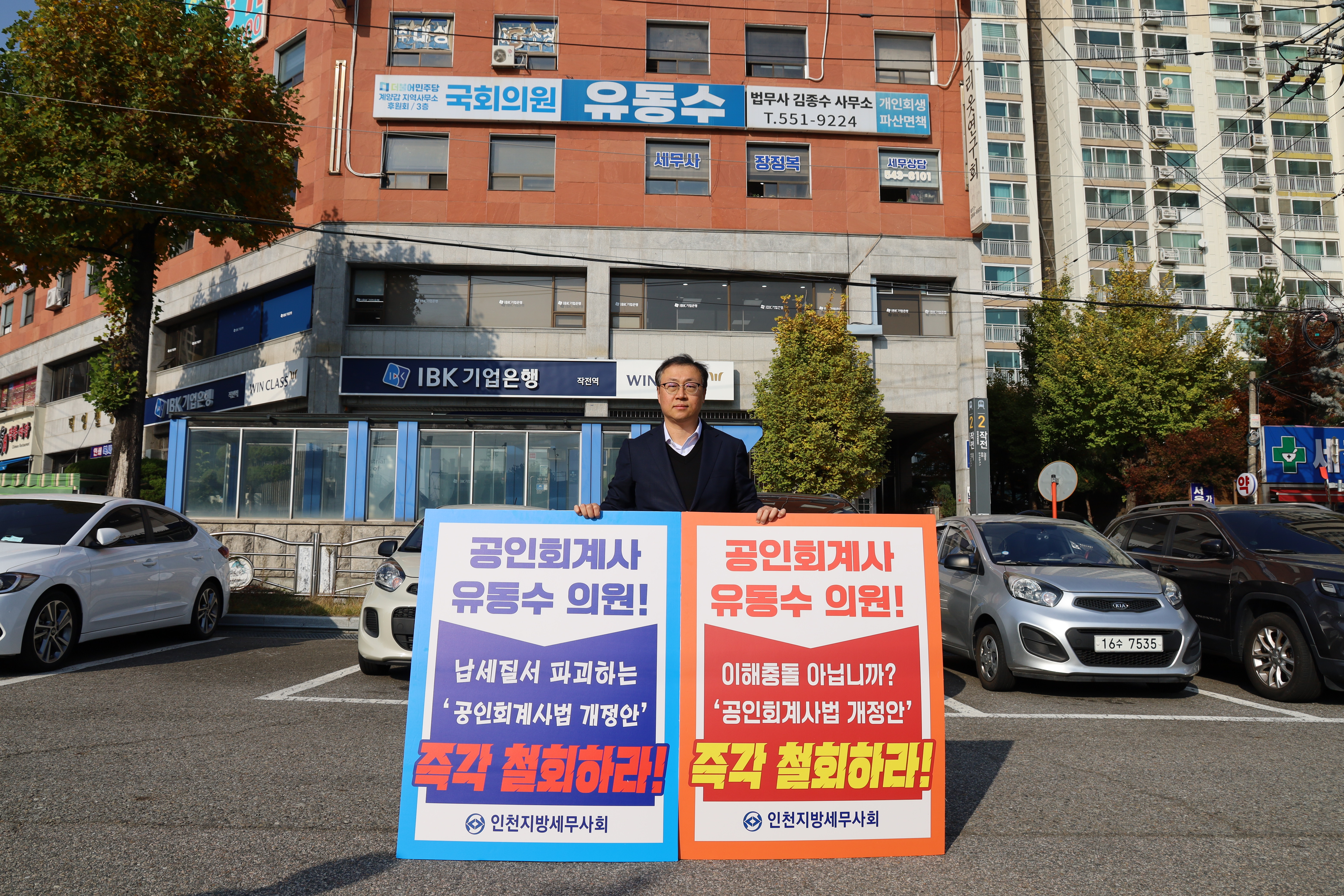 최병곤 인천지방세무사회장 등 임원과 지역회장 등은 인천시 계양구 유동수 국회의원(더불어민주당) 사무실 앞에서 ‘회계사를 세무전문가로, 세무사 직무를 공인회계사 직무로 명시’하는 공인회계사법 개정안의 즉각 철회를 주장하며 지난 12일부터 1인 시위를 펼치고 있다.