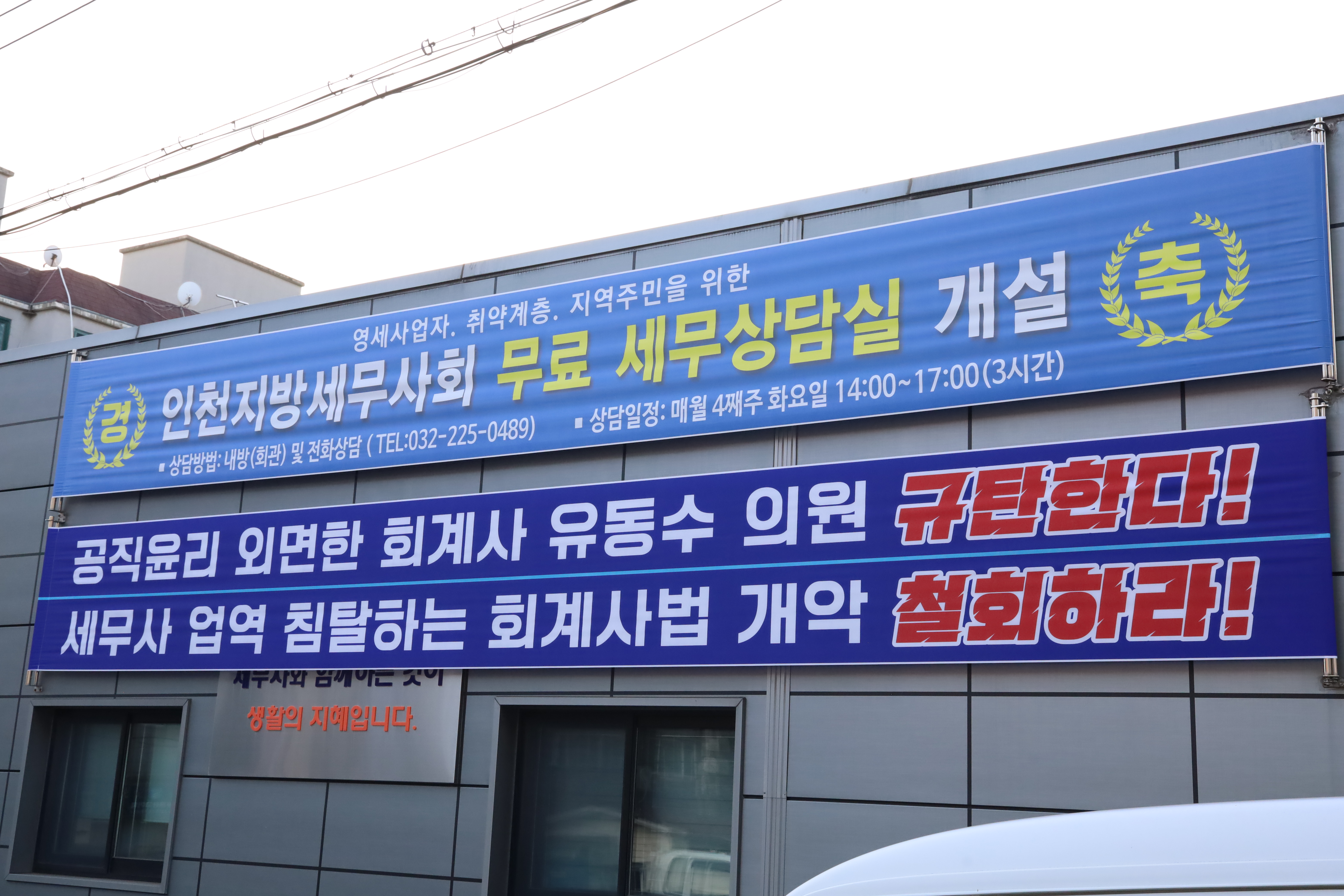 ▲ 인천지방세무사회관에 부착된 회계사법 개정안과 발의자인 유동수 의원 규탄 현수막