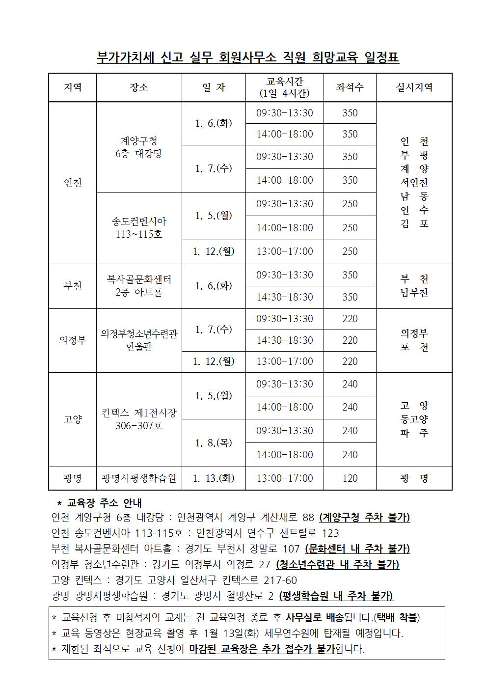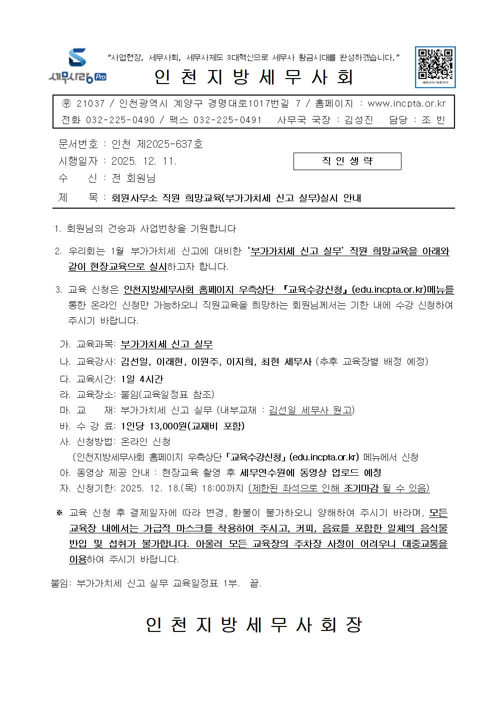 회원사무소 직원 희망교육(부가가치세 신고실무) 실시 안내