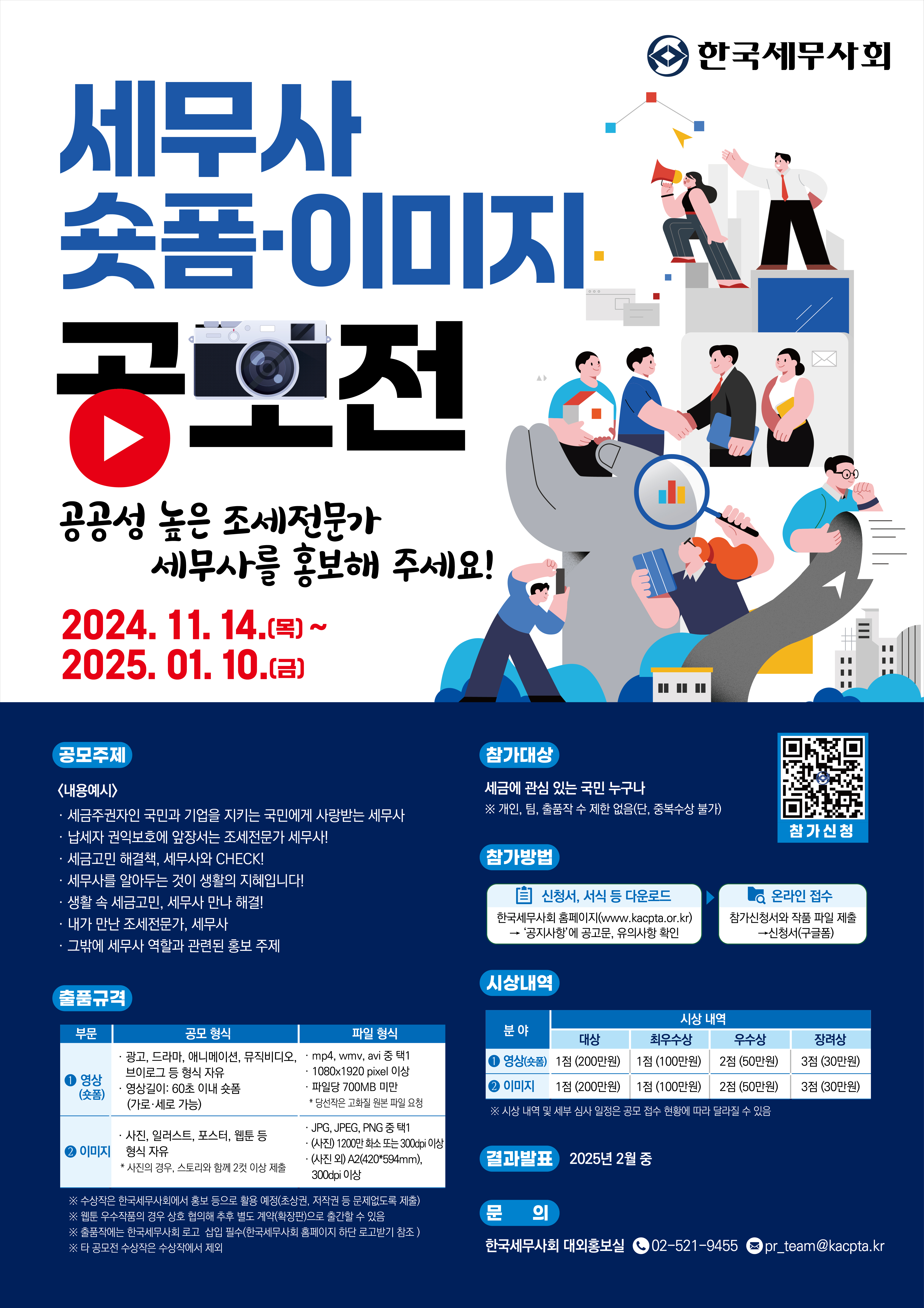 Çѱ¹¼¼¹«»çȸ´Â ±¹¹Î¿¡°Ô »ç¶û¹Þ´Â ¼¼¹«»ç»ó È®¸³À» À§ÇÑ ±¹¹Î Âü¿©Çü È«º¸ ÄÜÅÙÃ÷¸¦ ¹ß±¼Çϱâ À§ÇÏ¿© ¡¸¼¼¹«»ç ¼ôÆû¡¤À̹ÌÁö °ø¸ðÀü¡¹À» ´ÙÀ½°ú °°ÀÌ °³ÃÖÇÏ¿À´Ï ¸¹Àº °ü½É°ú Âü¿© ºÎʵ右´Ï´Ù. ¤· (°ø¸ð¸í) Çѱ¹¼¼¹«»çȸ <¼¼¹«»ç ¼ôÆû¡¤À̹ÌÁö °ø¸ðÀü> ¤· (°ø¸ð±â°£) 2024.11.14.(¸ñ)~2025.01.10.(±Ý) ¤· (°ø¸ðºÐ¾ß) ¿µ»ó(¼ôÆû), À̹ÌÁö(º°Ã· °ø°í¹® ÂüÁ¶) ¤· (Âü°¡´ë»ó) ¼¼±Ý¿¡ °ü½É ÀÖ´Â ±¹¹Î ´©±¸³ª ¤· (°ø¸ðÁÖÁ¦) °ø°ø¼º ³ôÀº Á¶¼¼Àü¹®°¡ ¼¼¹«»ç! - ¼¼±ÝÁÖ±ÇÀÚÀÎ ±¹¹Î°ú ±â¾÷À» ÁöŰ´Â ±¹¹Î¿¡°Ô »ç¶û¹Þ´Â ¼¼¹«»ç - ³³¼¼ÀÚ ±ÇÀͺ¸È£¿¡ ¾ÕÀå¼´Â Á¶¼¼Àü¹®°¡ ¼¼¹«»ç! - ¼¼±Ý°í¹Î ÇØ°áÃ¥, ¼¼¹«»ç¿Í CHECK! - ¼¼¹«»ç¸¦ ¾Ë¾ÆµÎ´Â °ÍÀÌ »ýȰÀÇ ÁöÇýÀÔ´Ï´Ù! - »ýȰ ¼Ó ¼¼±Ý°í¹Î, ¼¼¹«»ç ¸¸³ª ÇØ°á! - ³»°¡ ¸¸³ Á¶¼¼Àü¹®°¡, ¼¼¹«»ç - ±×¹Û¿¡ ¼¼¹«»ç ¿ªÇÒ°ú °ü·ÃµÈ È«º¸ ÁÖÁ¦ ¤· (°ø¸ð¹æ¹ý) ±¸±ÛÆûÀ» ÅëÇÑ ¿Â¶óÀÎ Á¢¼ö https://forms.gle/C1PeLFJZ92hscsqJ8 (*º°Ã· Âü°¡½Åû¼µî ¼½Ä 3Á¾ PDFÆÄÀÏ, °ø¸ðÀÛǰ ÷ºÎ) ¤· (½Ã»ó³»¿ª) ´ë»ó 2¸í(°¢ 200¸¸¿ø), ÃÖ¿ì¼ö»ó 2¸í(°¢ 100¸¸¿ø), ¿ì¼ö»ó 4¸í(°¢ 50¸¸¿ø), Àå·Á»ó 6¸í(°¢ 30¸¸¿ø) ¤· (°á°ú¹ßÇ¥) 2025³â 2¿ù Áß ¤· (¹®ÀÇ) : ´ë¿ÜÈ«º¸½Ç(02-521-9455, pr_team@kacpta.kr)