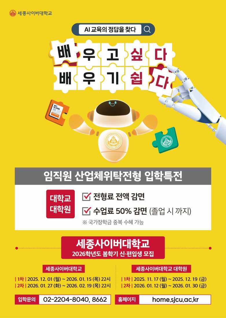 ¼¼Á¾»çÀ̹ö´ëÇб³¿¡¼ ¡®2026Çг⵵ º½Çб⠽š¤ÆíÀÔ»ý ¸ðÁý ¾È³»¡¯¿Í °ü·ÃÇÏ¿© ¿ì¸® ȸ¿¡ È«º¸ ¿äûÇÏ¿´±â¿¡ ¾Æ·¡¿Í °°ÀÌ ¾È³»ÇÕ´Ï´Ù. 1. ¸ðÁý±â°£ 1) 1Â÷ ¸ðÁý±â°£: 2025.12.1.(¿ù)~2026.1.15.(¸ñ) 2) 2Â÷ ¸ðÁý±â°£: 2026.1.27.(È)~2026.2.19.(¸ñ) 2. Áö¿ø¹æ¹ý: ÀÎÅÍ³Ý ¿ø¼ Á¢¼ö(ÀÔÇÐÁö¿ø¼¾ÅÍ È¨ÆäÀÌÁö: https://go.sjcu.ac.kr/go/) 3. ÇÕ°ÝÀÚ ¹ßÇ¥ 1) 1Â÷ ¸ðÁý¹ßÇ¥: 2026.1.21.(¼ö) 2) 1Â÷ ¸ðÁý¹ßÇ¥: 2026.2.25.(¼ö) 4.. ¹®ÀÇó: ¼¼Á¾»çÀ̹ö´ëÇб³ ¼¼¹«È¸°èÇаú: 02-2204-8040(8662)