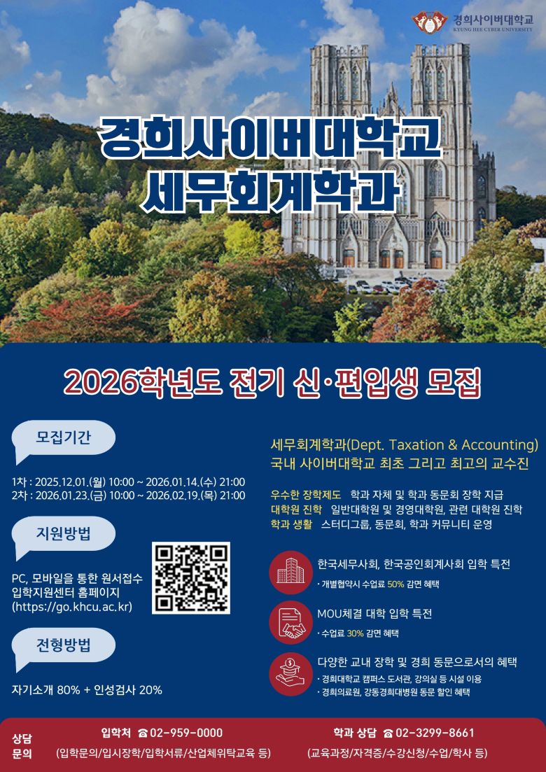 °æÈñ»çÀ̹ö´ëÇб³¿¡¼ ¡®¼¼¹«È¸°èÇаú 2026Çг⵵ Àü±â ½Å¡¤ÆíÀÔ»ý ¸ðÁý ¾È³»¡¯¿Í °ü·ÃÇÏ¿© ¿ì¸® ȸ¿¡ È«º¸ ¿äûÇÏ¿´±â¿¡ ¾Æ·¡¿Í °°ÀÌ ¾È³»ÇÕ´Ï´Ù. 1. ¸ðÁý±â°£ 1) 1Â÷ ¸ðÁý±â°£: 2025.12.1.(¿ù) 10:00 ~ 2026.1.14.(¼ö) 21:00 2) 2Â÷ ¸ðÁý±â°£: 2026.1.23.(±Ý) 10:00 ~ 2026.2.19.(¸ñ) 21:00 2. Áö¿ø¹æ¹ý: ÀÎÅÍ³Ý ¿ø¼ Á¢¼ö(ÀÔÇоȳ» ȨÆäÀÌÁö: https://go.khcu.ac.kr) 3. ÇÕ°ÝÀÚ ¹ßÇ¥ 1) 1Â÷ ¸ðÁý¹ßÇ¥: 2026.1.20.(È) 10:00 2) 1Â÷ ¸ðÁý¹ßÇ¥: 2026.2.25.(¼ö) 10:00 4.. ¹®ÀÇó: ¼¼Á¾»çÀ̹ö´ëÇб³ ¼¼¹«È¸°èÇаú: 02-2204-8040(8662)