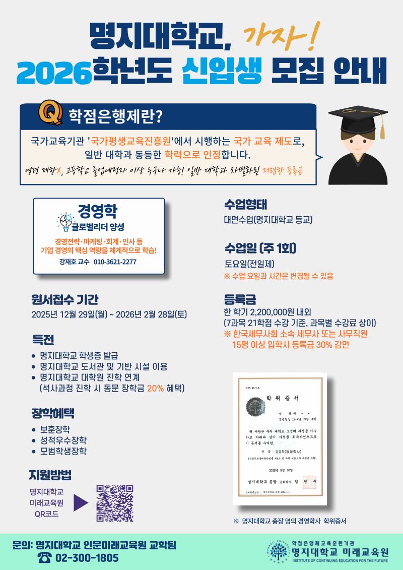 ¸íÁö´ëÇб³ ¹Ì·¡±³À°¿ø¿¡¼ ¡®2026Çг⵵ ½ÅÀÔ»ý ¸ðÁý¡¯À» ÇÏ¿À´Ï °ü½ÉÀÖ´Â ºÐ²²¼´Â Áö¿øÇϽñ⠹ٶø´Ï´Ù. 1. ¿ø¼Á¢¼ö: 2025. 12. 29.(¿ù) ~ 2026. 2. 28.(Åä) 2. Çаú: °æ¿µÇÐ(°æ¿µÀü·«, ¸¶ÄÉÆÃ, ¼¼¹«, ÀÎ»ç µî) 3. ƯÀü: - ¸íÁö´ëÇб³ ÇлýÁõ ¹ß±Þ - ¸íÁö´ëÇб³ µµ¼°ü ¹× ±â¹Ý ½Ã¼³ ÀÌ¿ë - ¸íÁö´ëÇб³ ´ëÇпø ÁøÇÐ ¿¬°è(¼®»ç°úÁ¤ ÁøÇÐ ½Ã µ¿¹® ÀåÇÐ±Ý 20% ÇýÅÃ) 4. ¼ö¾÷ÇüÅÂ: ´ë¸é¼ö¾÷(ÁÖ1ȸ Åä¿äÀÏ ÀüÀÏÁ¦) 5. ȨÆäÀÌÁö: https://ice1.mju.ac.kr/ice1/index.do 6. ¹®ÀÇÀüÈ: ¸íÁö´ëÇб³ Àι®¹Ì·¡±³À°¿ø ±³ÇÐÆÀ (02-300-1805)