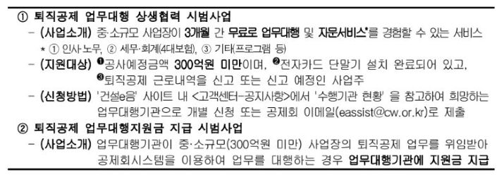 1. ȸ¿ø´ÔÀÇ °Ç°°ú »ç¾÷ÀÇ ¹øÃ¢À» ±â¿øµå¸³´Ï´Ù.2. °Ç¼³±Ù·ÎÀÚ°øÁ¦È¸´Â Áß¼Ò±Ô¸ð °Ç¼³»ç¾÷ÁÖÀÇ ÅðÁ÷°øÁ¦ ¾÷¹«ºÎ´ã °æ°¨µîÀ» À§ÇØ ÅðÁ÷°øÁ¦ ¾÷¹«´ëÇà ¼ºñ½º °ü·Ã ½Ã¹ü»ç¾÷À» ½Ç½ÃÇϰí ÀÖ½À´Ï´Ù. 3. °Ç¼³±Ù·ÎÀÚ°øÁ¦È¸¿¡¼ ¿ì¸®È¸¿¡ ¡®ÅðÁ÷°øÁ¦ ¾÷¹«´ëÇà ¼ºñ½º °ü·Ã ½Ã¹ü»ç¾÷¡® °ü·Ã È«º¸ ÇùÁ¶À» ÇØ¿Ô±â¿¡ ºÙÀÓ°ú °°ÀÌ ¾È³» µå¸®¿À´Ï ¾÷¹«¿¡ Âü°íÇϽñ⠹ٶø´Ï´Ù. ºÙÀÓ : 1. (ºÙÀÓ1) ÅðÁ÷°øÁ¦ ¾÷¹«´ëÇà »ó»ýÇù·Â ½Ã¹ü»ç¾÷ È«º¸³»¿ë 1ºÎ. 2. (ºÙÀÓ2) ÅðÁ÷°øÁ¦ ¾÷¹«´ëÇàÁö¿ø±Ý Áö±Þ ½Ã¹ü»ç¾÷ È«º¸³»¿ë 1ºÎ. ³¡.