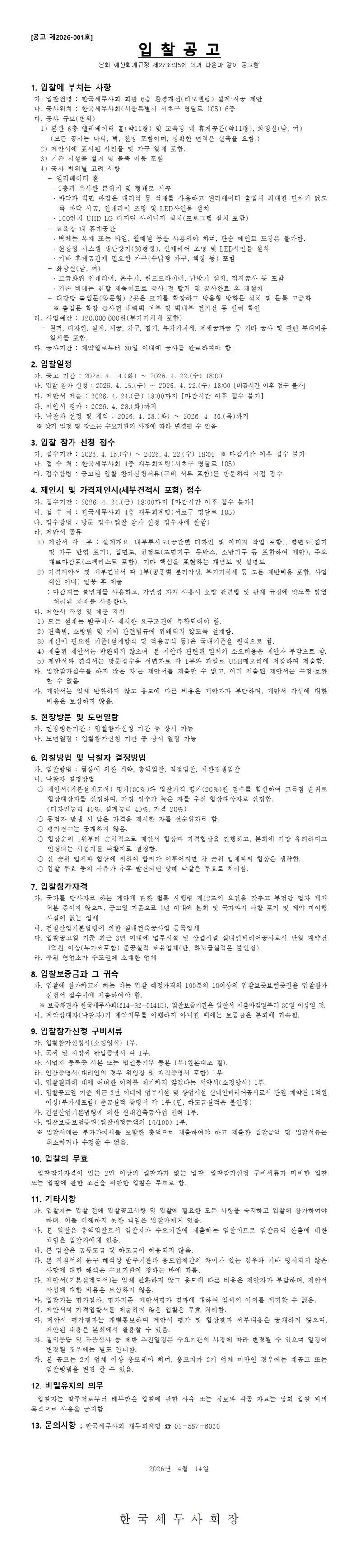 [ÀÔÂû°ø°í]¡¸Çѱ¹¼¼¹«»çȸ ȸ°ü 6Ãþ ȯ°æ°³¼±(¸®¸ðµ¥¸µ) ¼³°è¡¤½Ã°ø¡¹Á¦¾È ÀÔÂû°ø°í